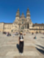 [Image Description: Hannah standing in front of the Cathedral de Santiago de Compostela in Galicia, Spain. This commemorates the end of her 100km walk called the "Camino de Santiago", a popular pilgrimage for travelers around the world.]